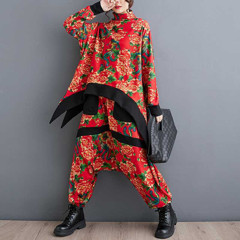 Fashion Peony Big Flower Youthful-looking Loose Top Baggy Pants Two-piece Set