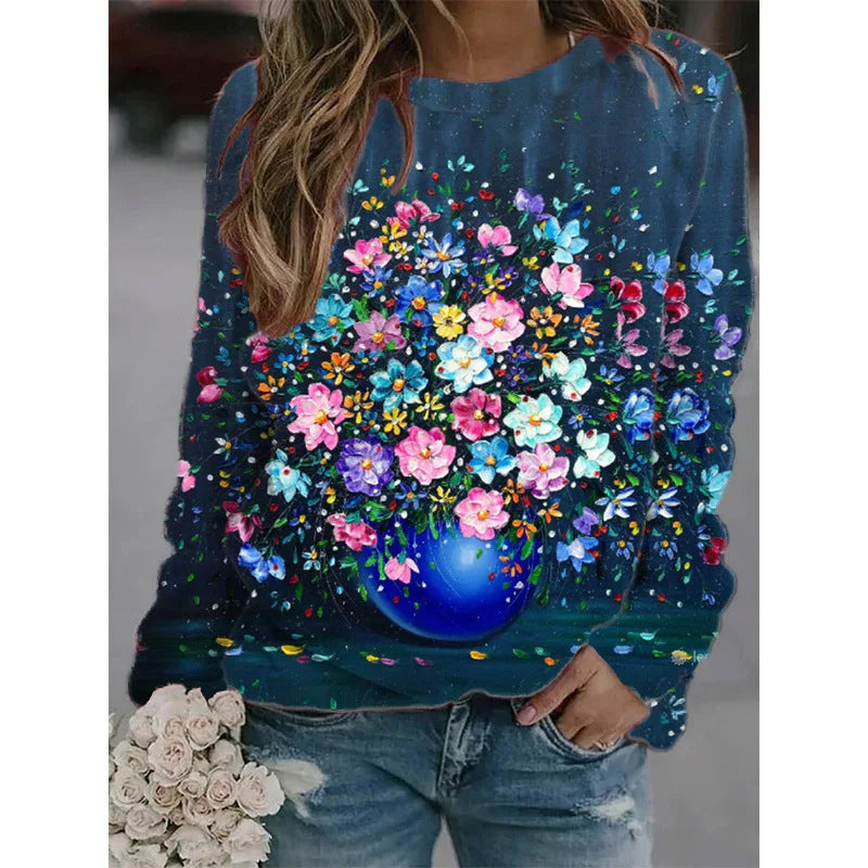 Oil Painting Colorful Flowers Women's Long-sleeved Pullover Top